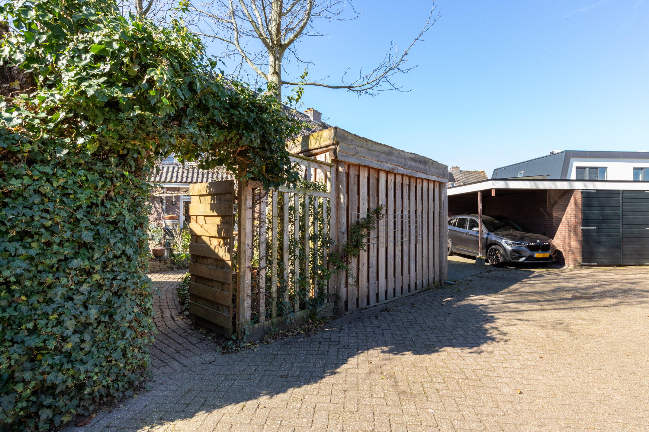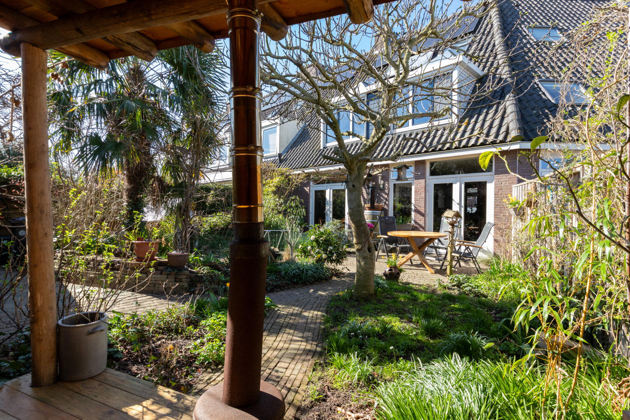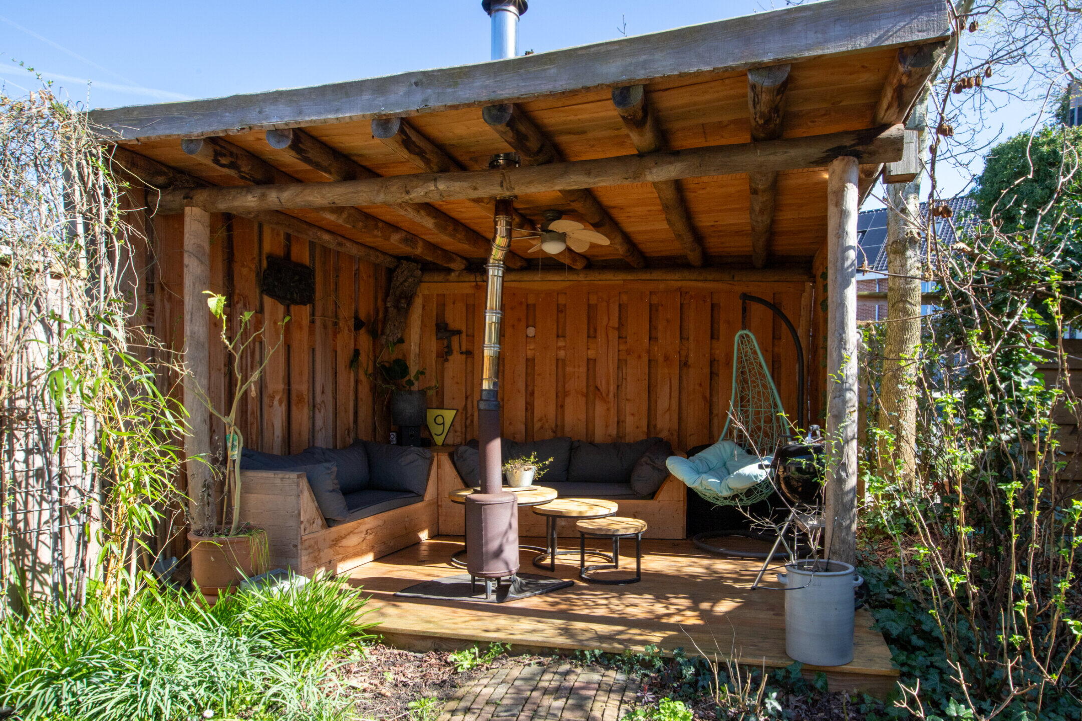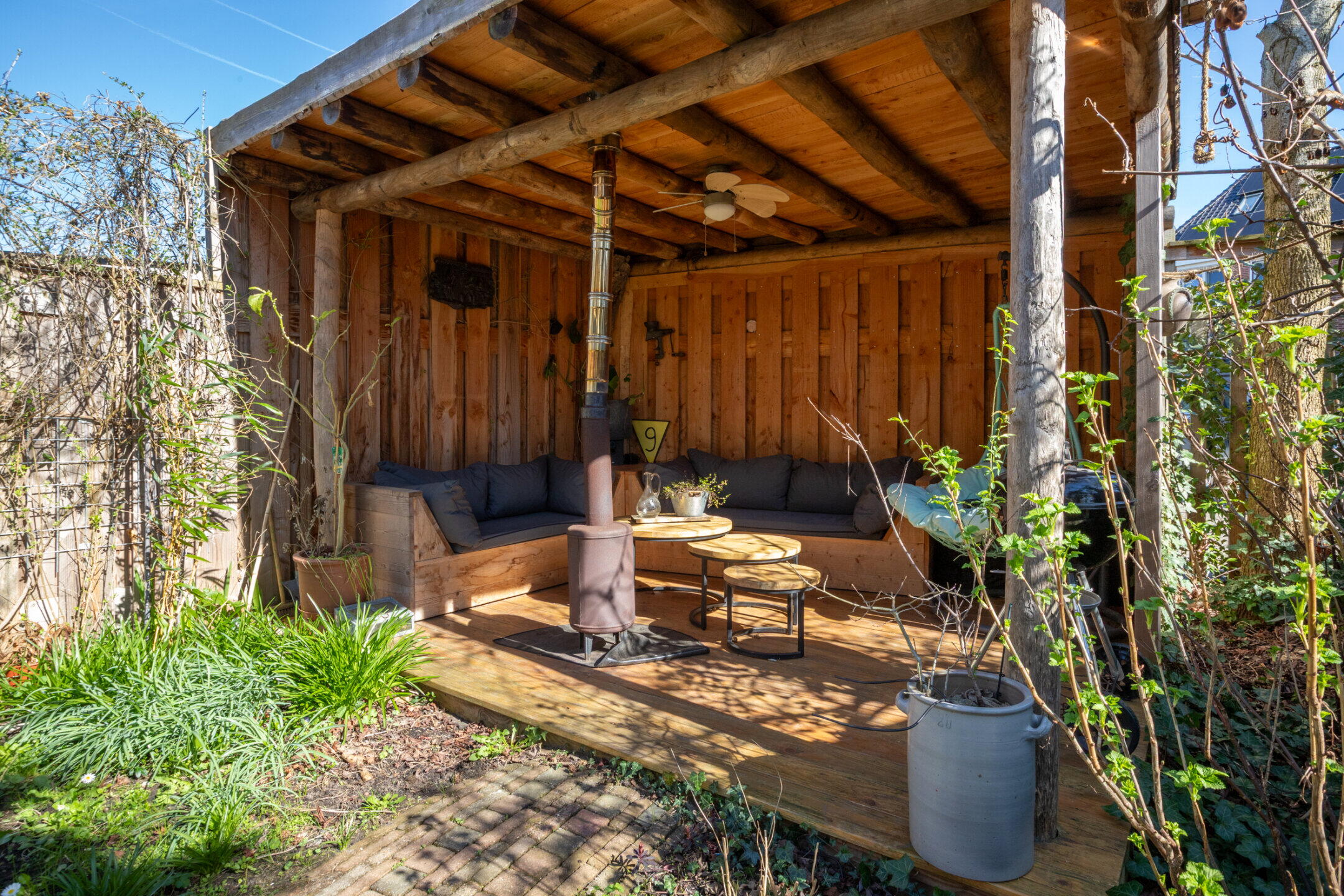 De woning beschikt over een op het oosten georiënteerde, zeer royale achtertuin van ca. 14 meter diep. Links achterin staat een overkapping met eikenhouten palen en douglas houten delen met houtkachel van ca. 12 m² (4 x 3 m), ideaal voor gezellige avonden buiten. Verder is er een achterom en een garage annex carport met een breedte van 2,50 m, plus een stenen berging voor extra opslag.