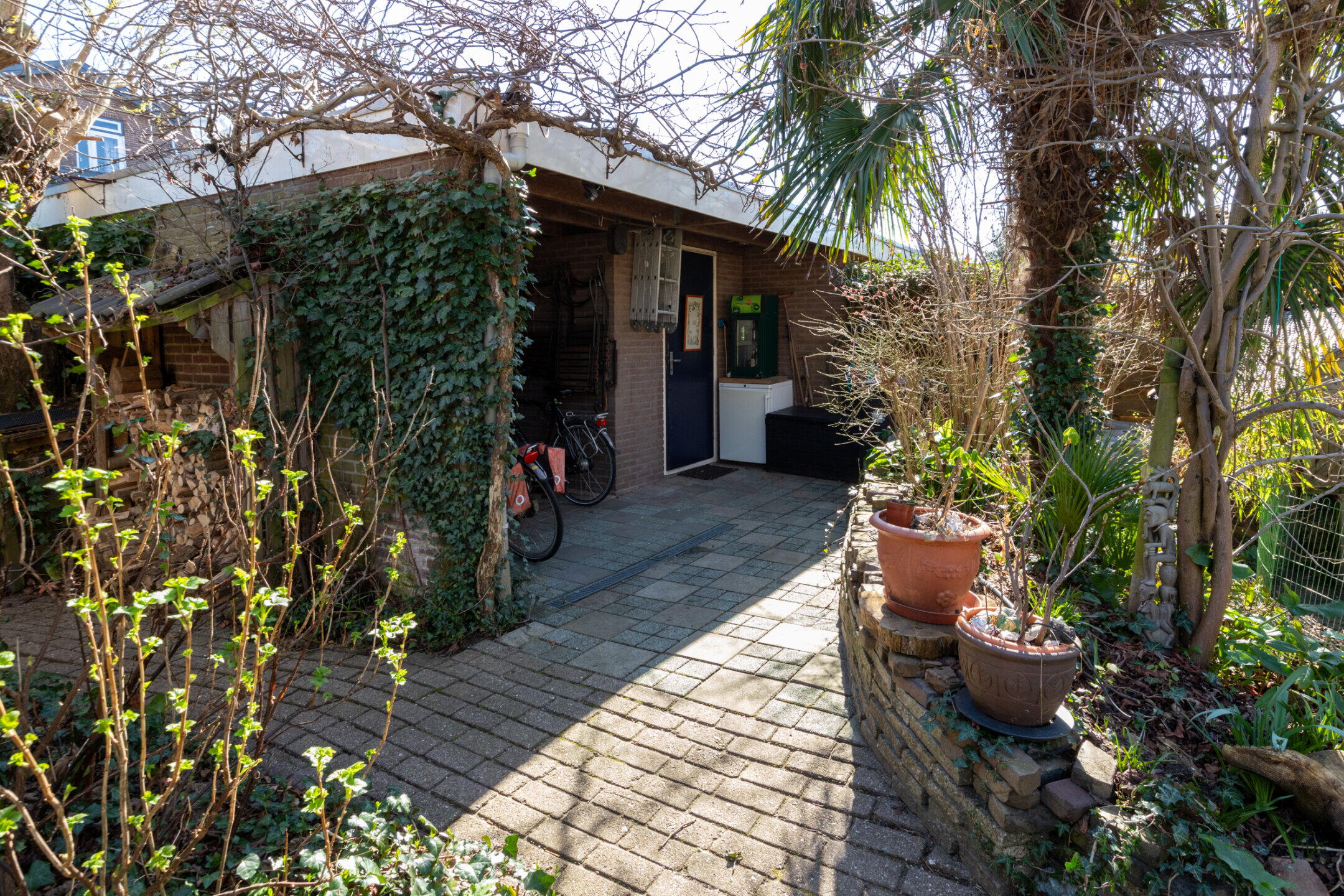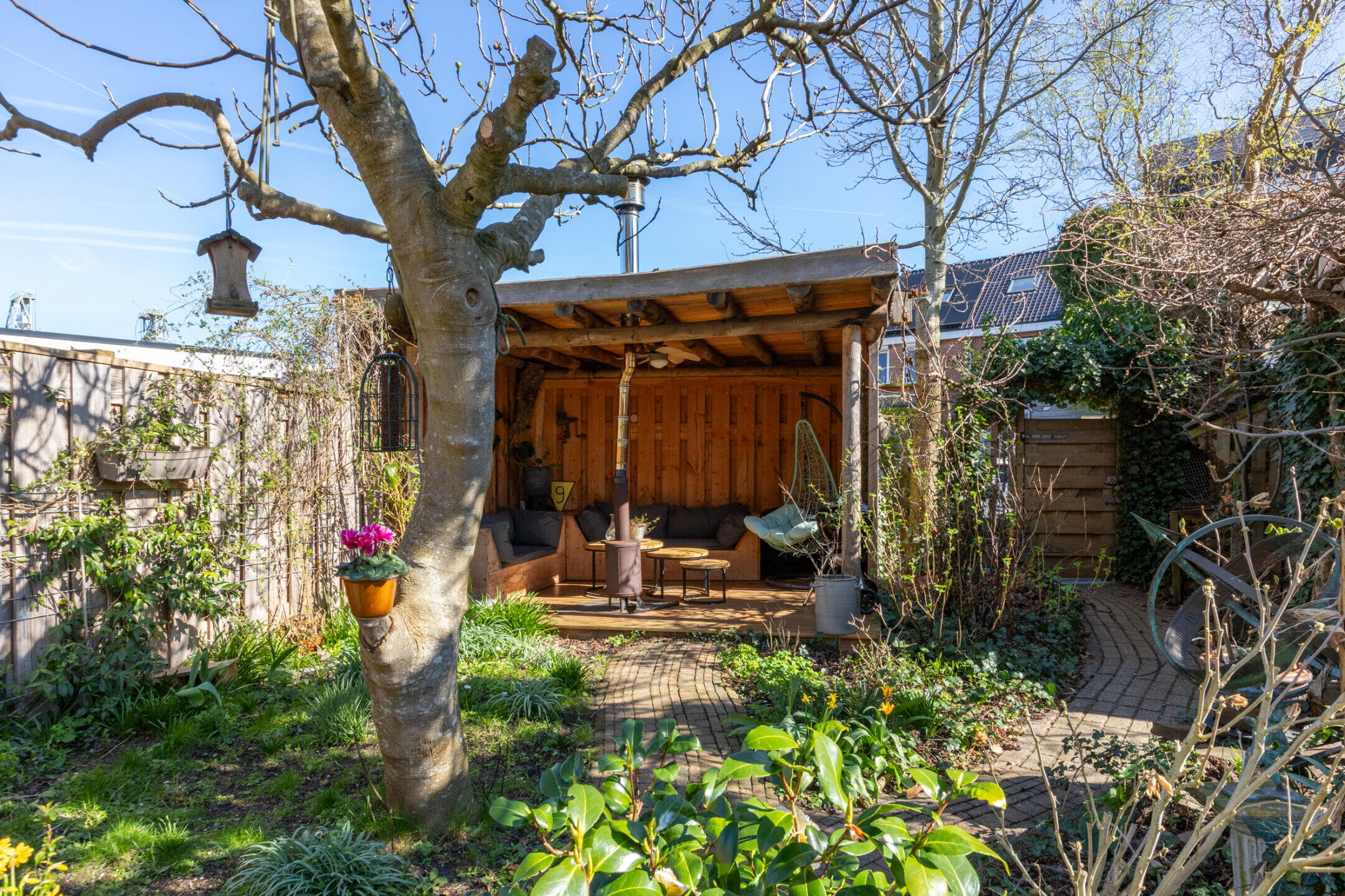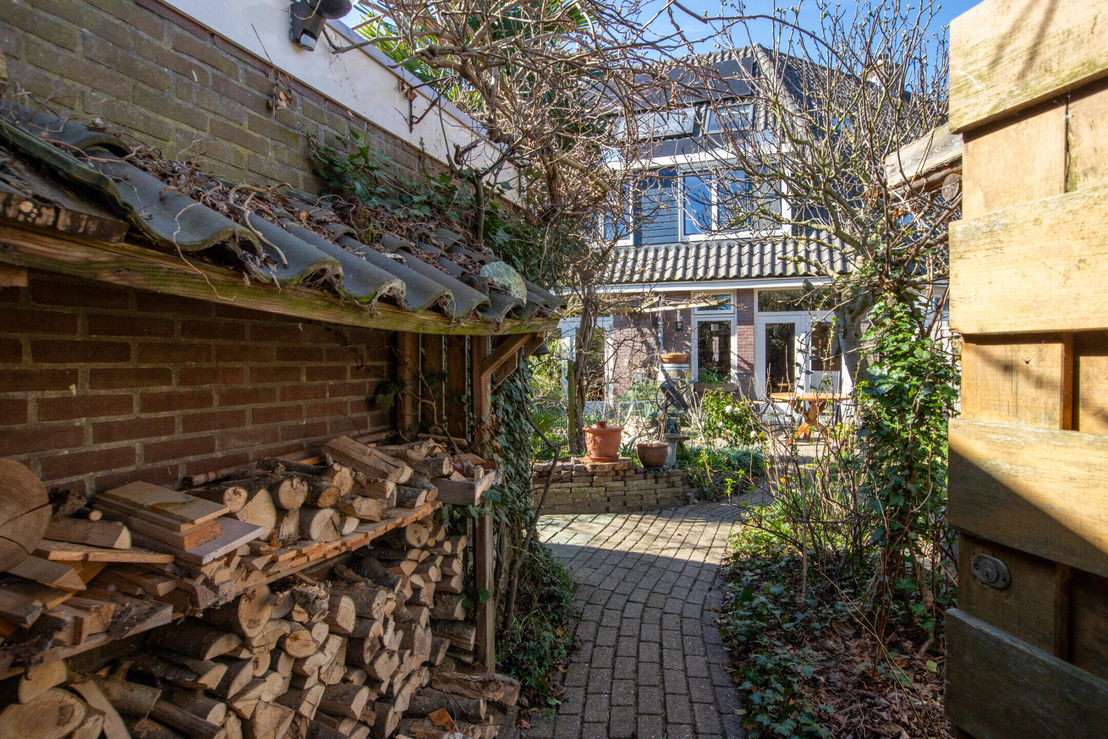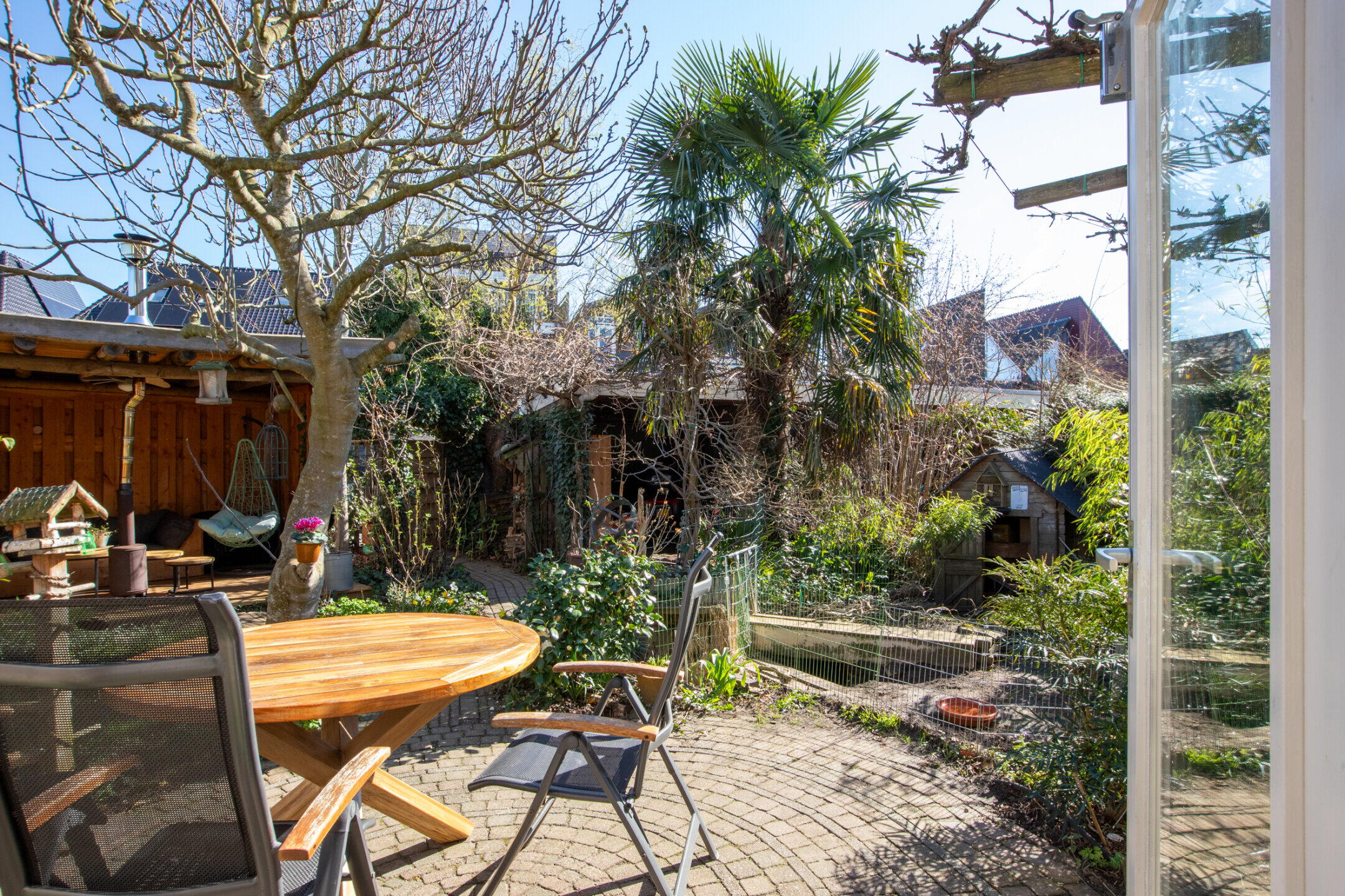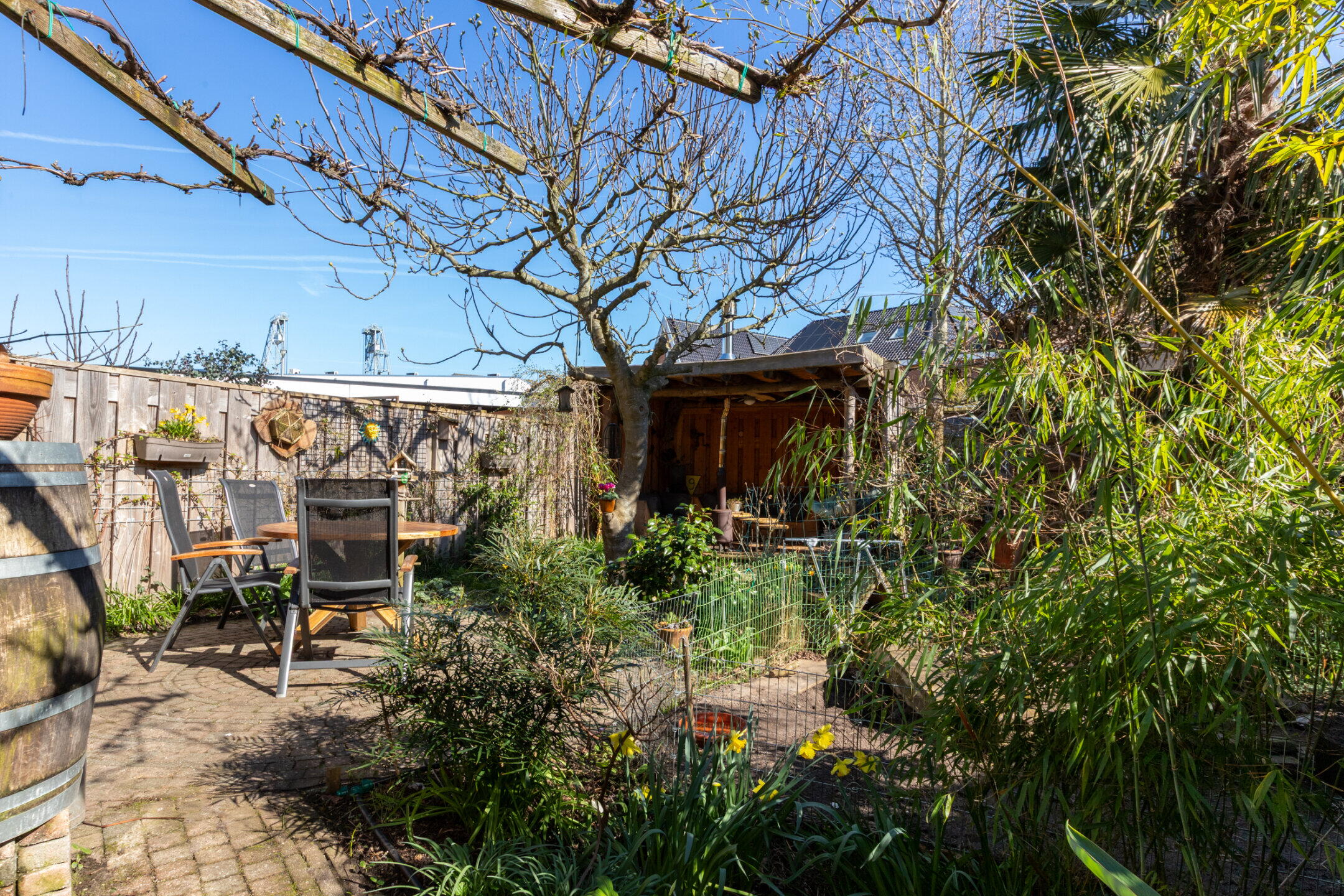 De woning beschikt over een op het oosten georiënteerde, zeer royale achtertuin van ca. 14 meter diep. Links achterin staat een overkapping met eikenhouten palen en douglas houten delen met houtkachel van ca. 12 m² (4 x 3 m), ideaal voor gezellige avonden buiten. Verder is er een achterom en een garage annex carport met een breedte van 2,50 m, plus een stenen berging voor extra opslag.