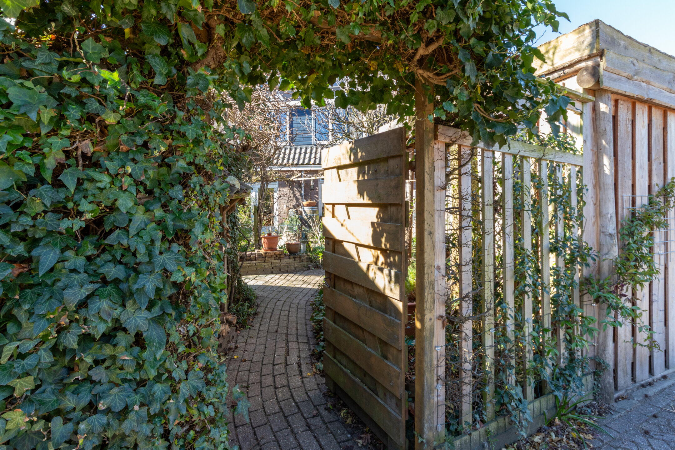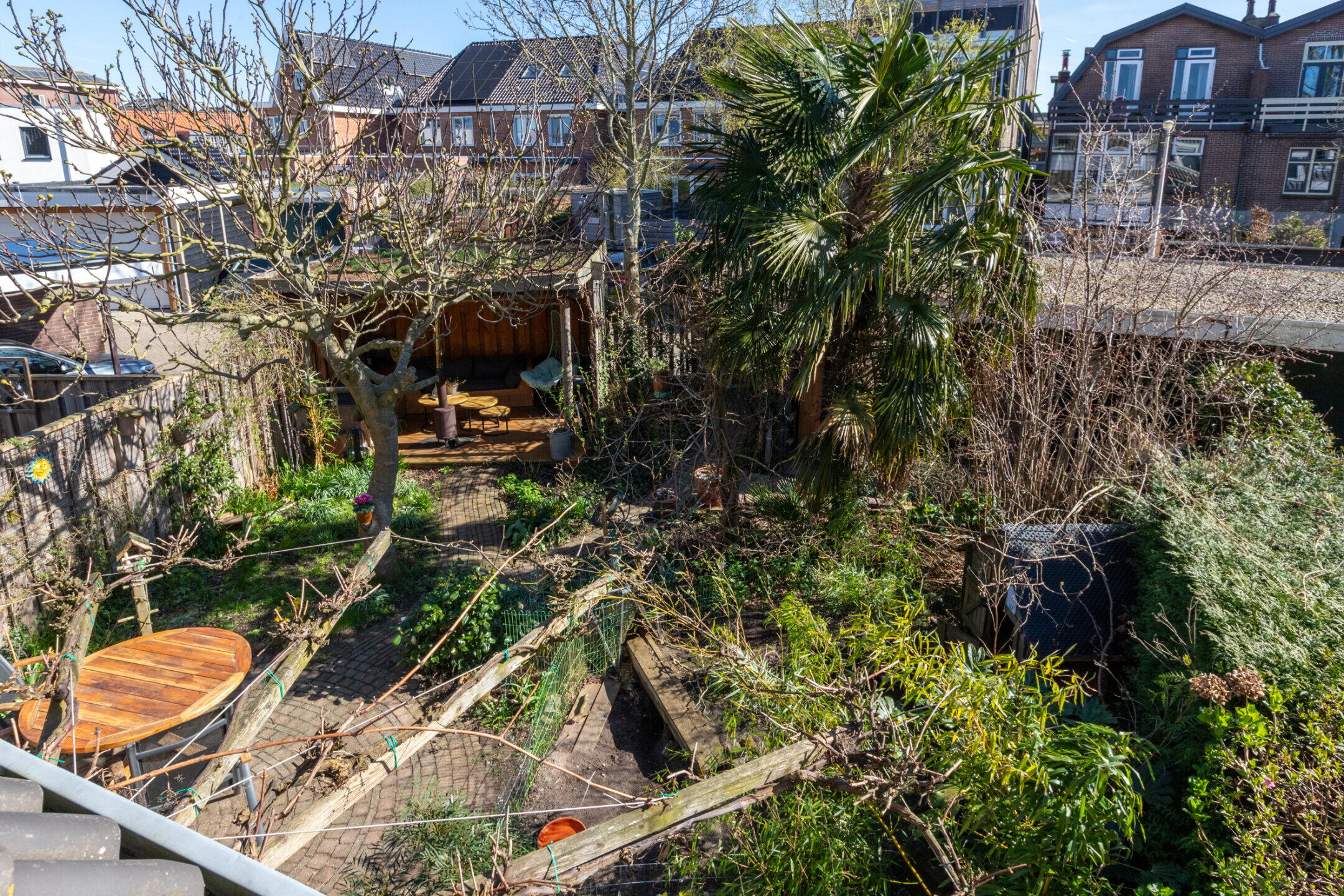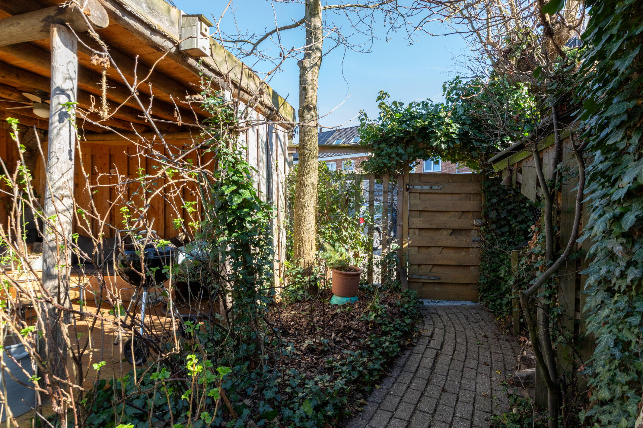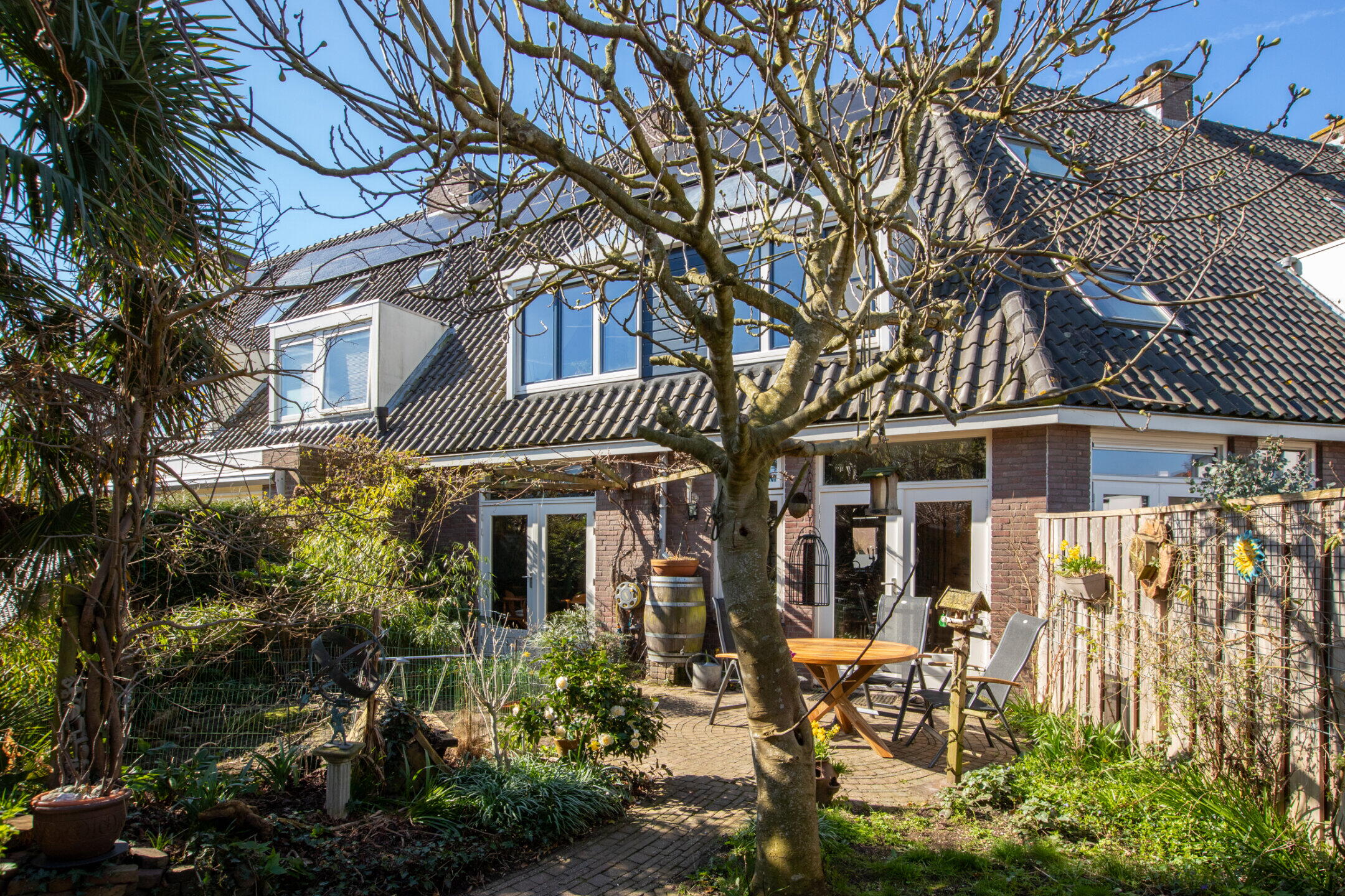 De woning beschikt over een op het oosten georiënteerde, zeer royale achtertuin van ca. 14 meter diep. Links achterin staat een overkapping met eikenhouten palen en douglas houten delen met houtkachel van ca. 12 m² (4 x 3 m), ideaal voor gezellige avonden buiten. Verder is er een achterom en een garage annex carport met een breedte van 2,50 m, plus een stenen berging voor extra opslag.