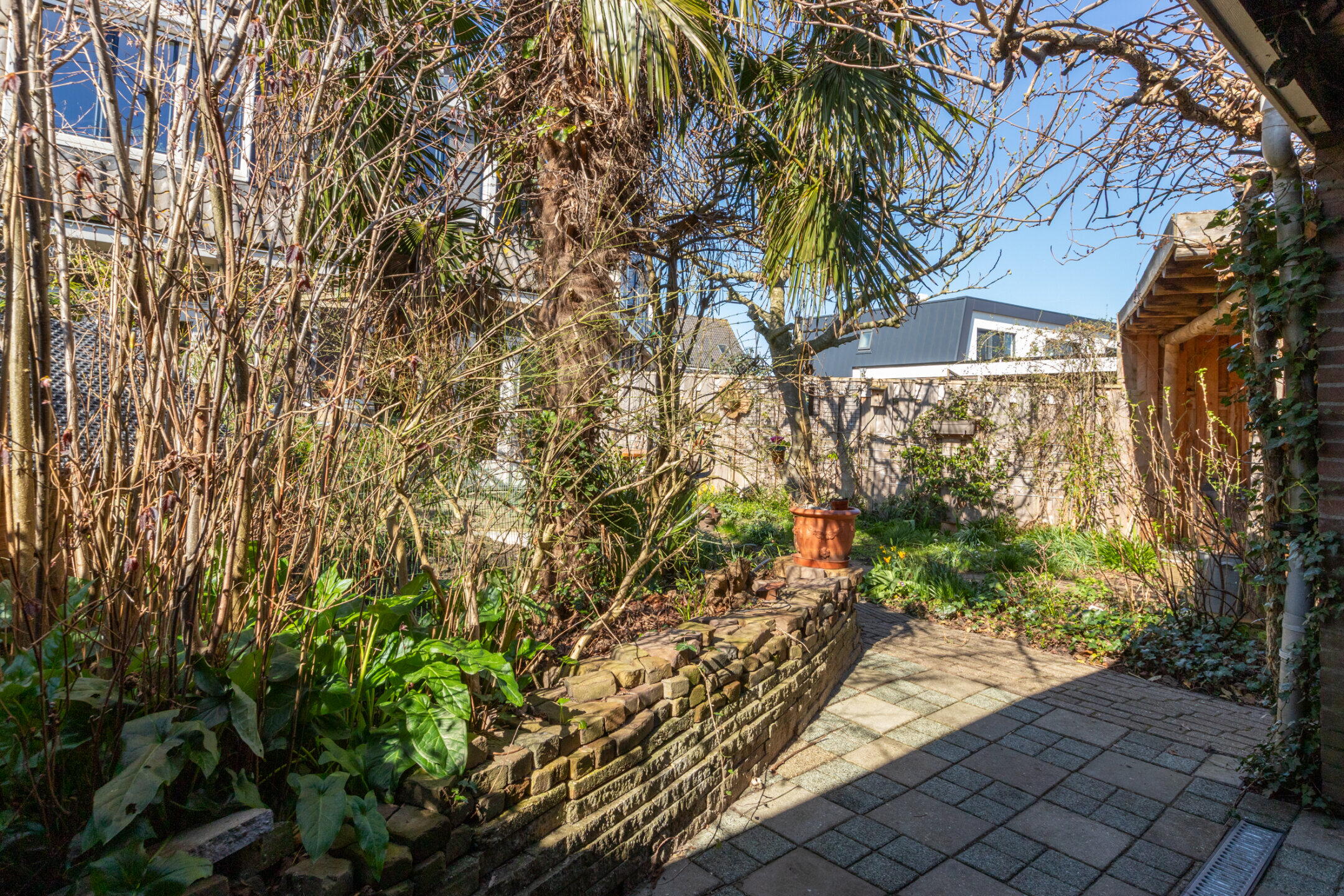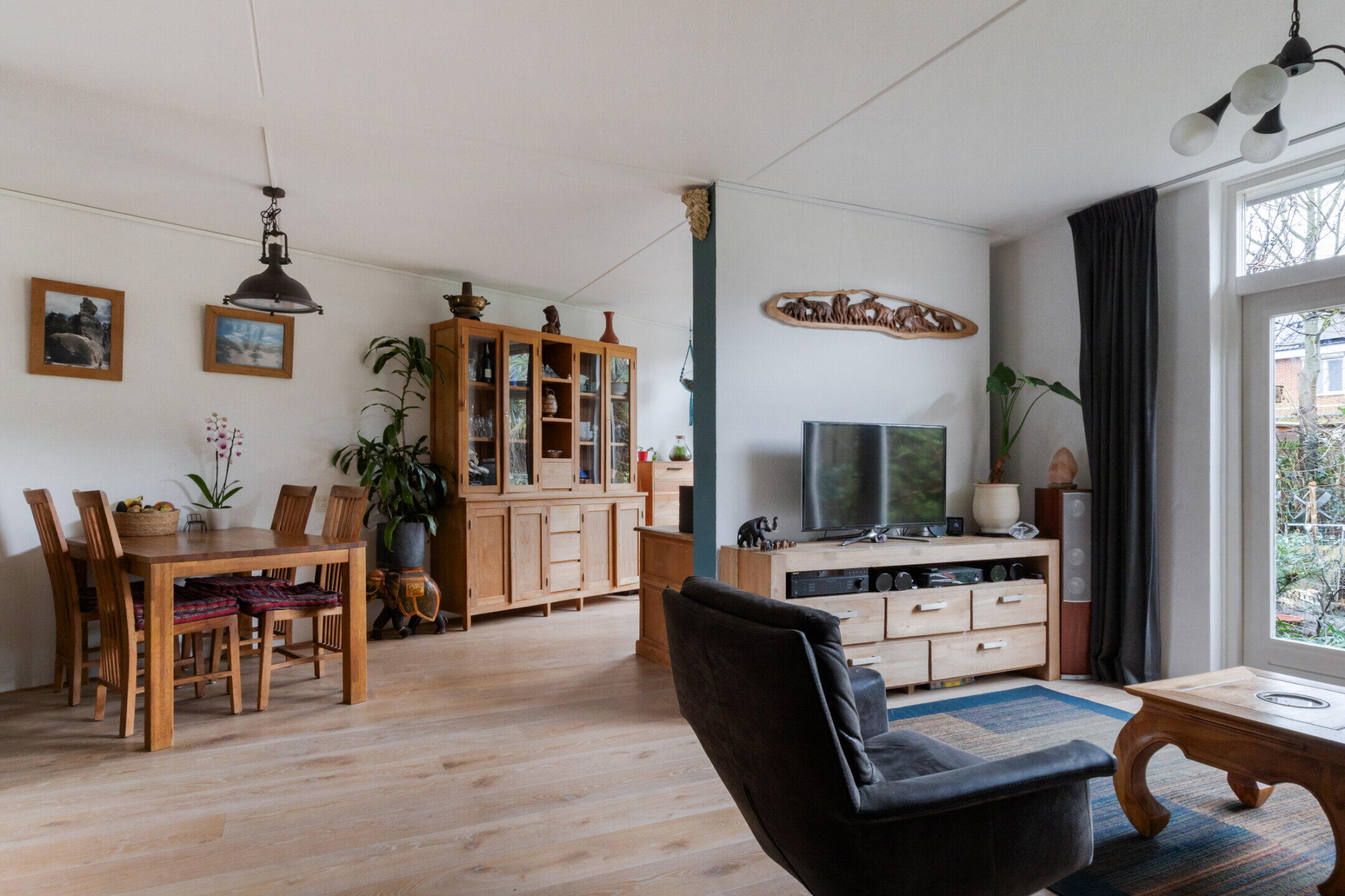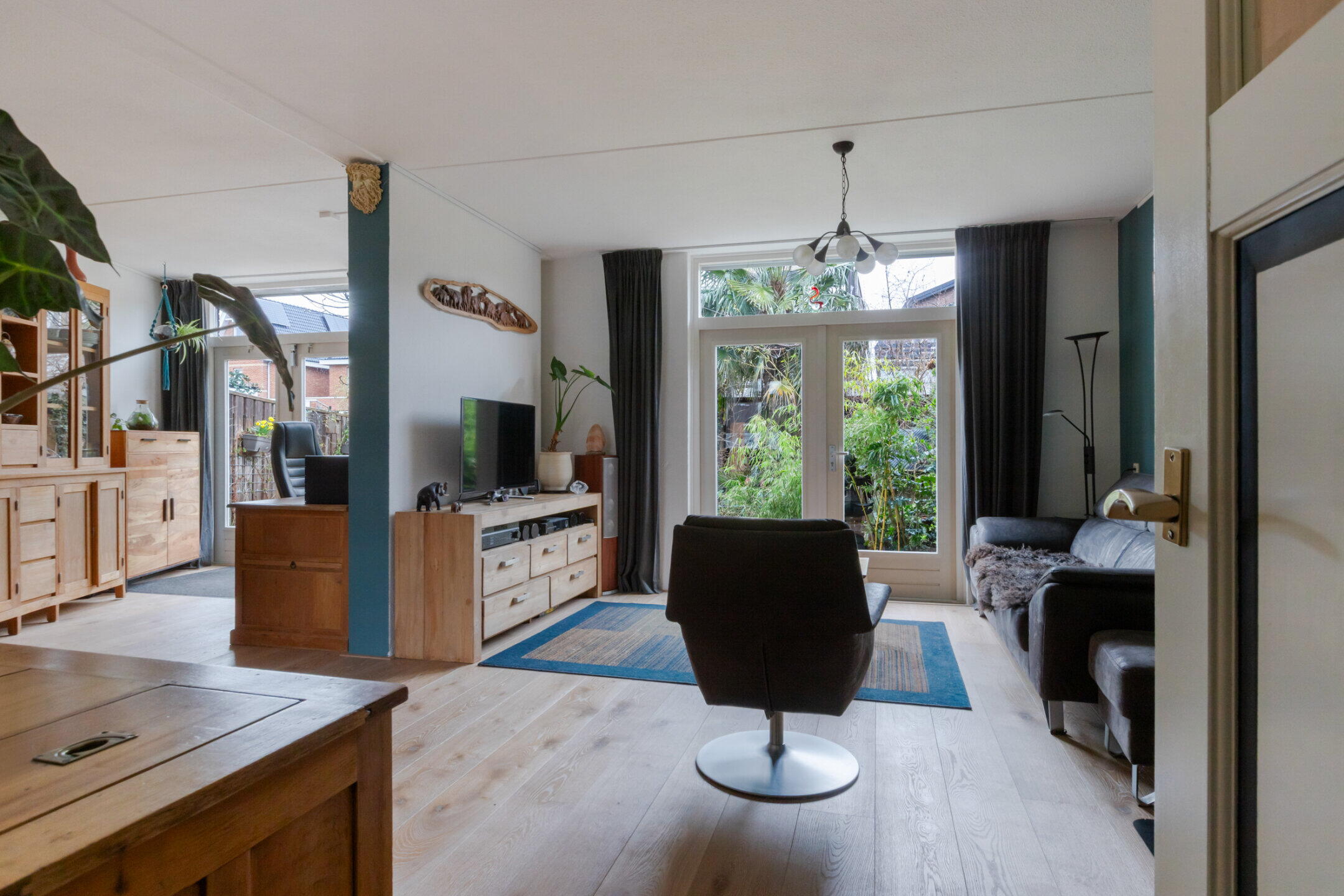 Aan de voorzijde ligt de U-vormige lichte keuken, compleet met inbouwapparatuur. Dankzij de waaiervormige plattegrond – smal aan de voorzijde en breed aan de achterzijde – is er een mooie verbinding met de tuin, waardoor veel licht naar binnen valt. De gehele begane grond is voorzien van een massieve eikenvloer, wat bijdraagt aan een warme en stijlvolle uitstraling.