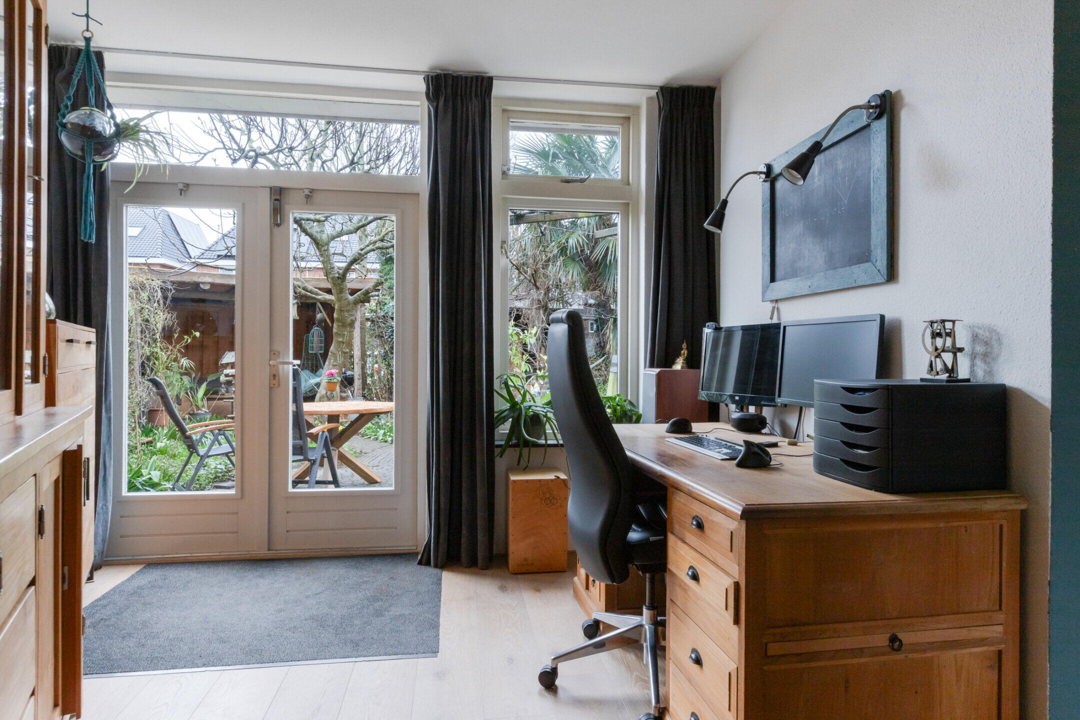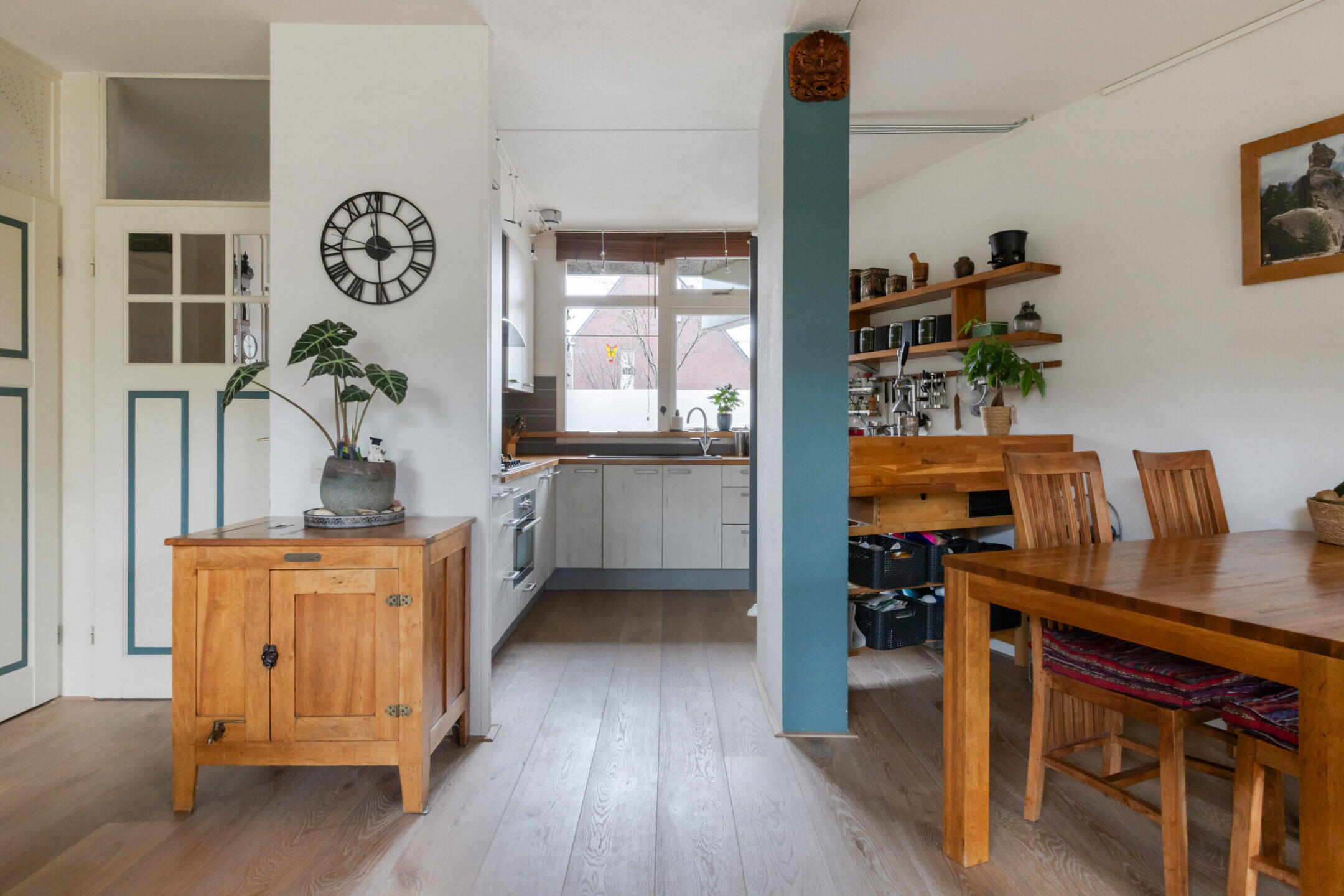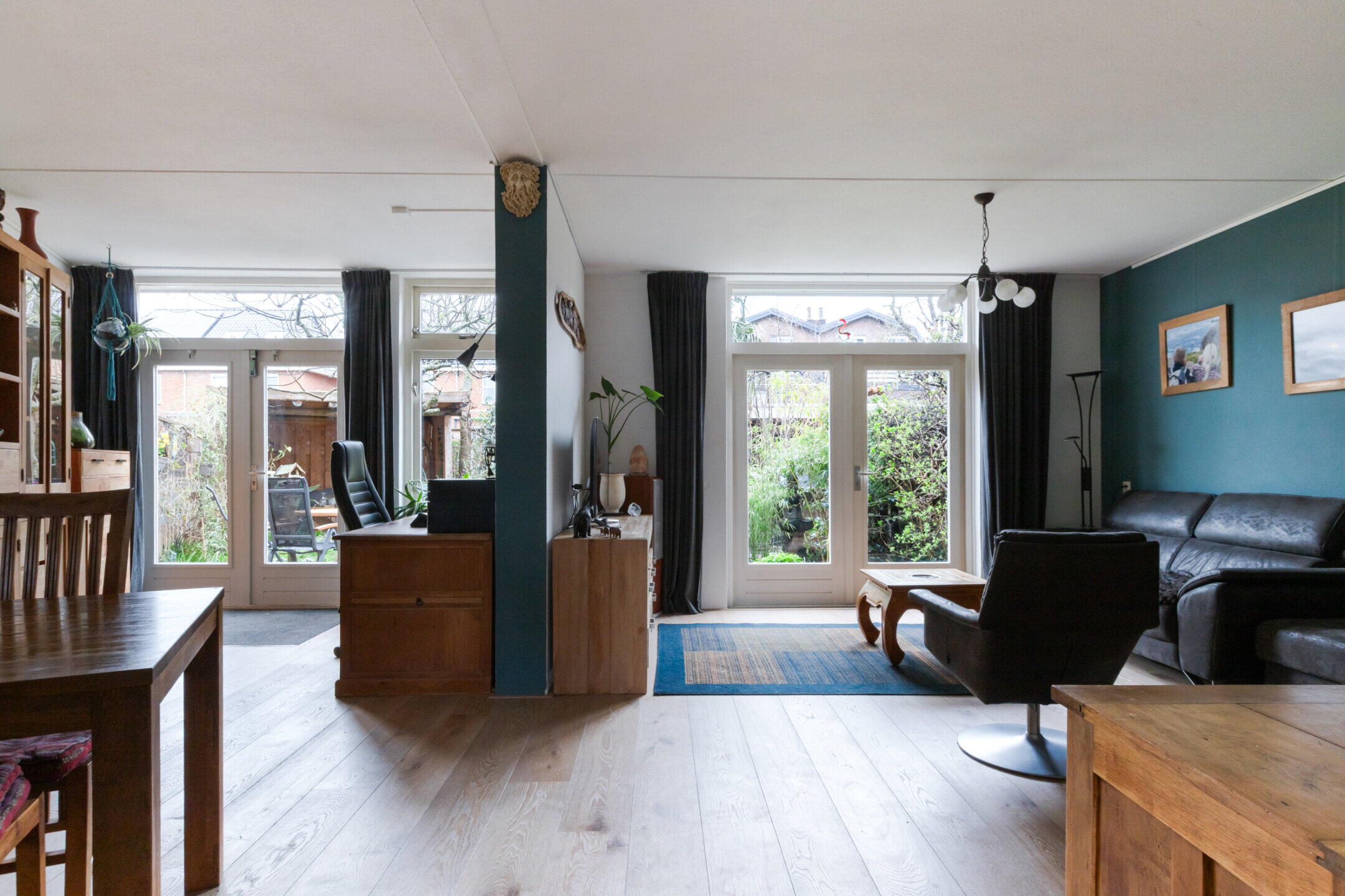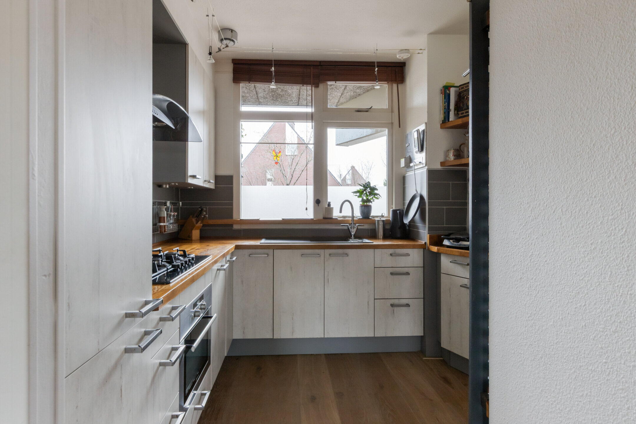 Aan de voorzijde ligt de U-vormige lichte keuken, compleet met inbouwapparatuur. Dankzij de waaiervormige plattegrond – smal aan de voorzijde en breed aan de achterzijde – is er een mooie verbinding met de tuin, waardoor veel licht naar binnen valt. De gehele begane grond is voorzien van een massieve eikenvloer, wat bijdraagt aan een warme en stijlvolle uitstraling.