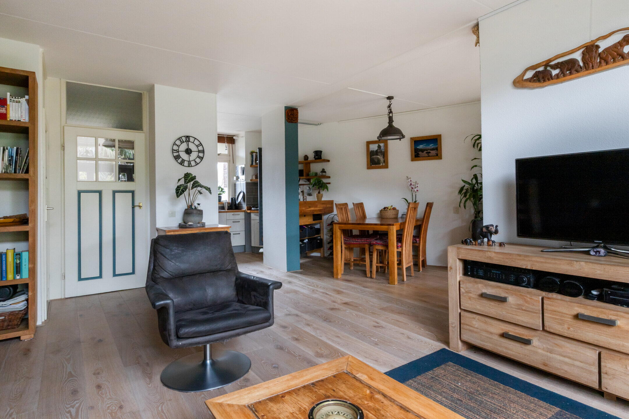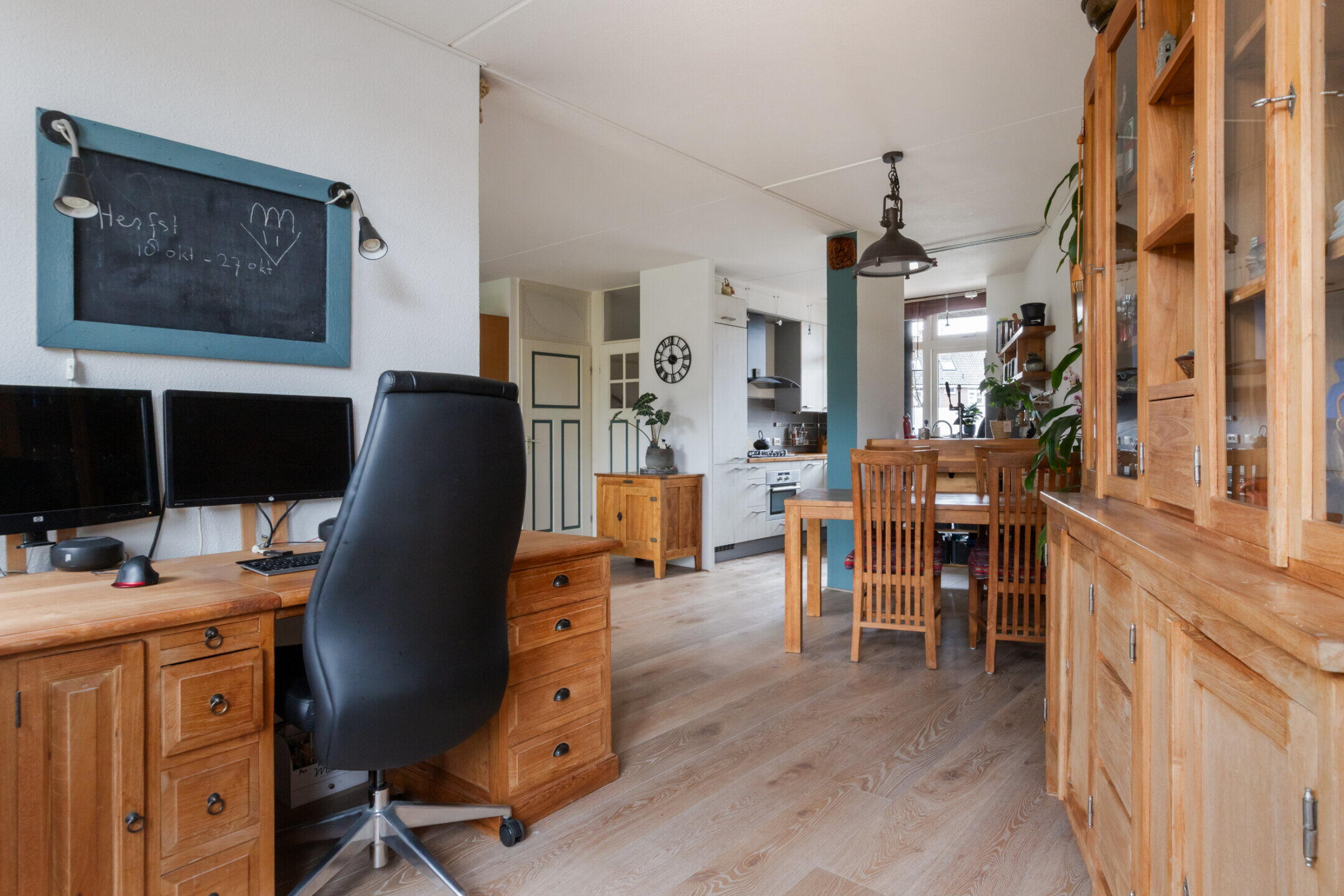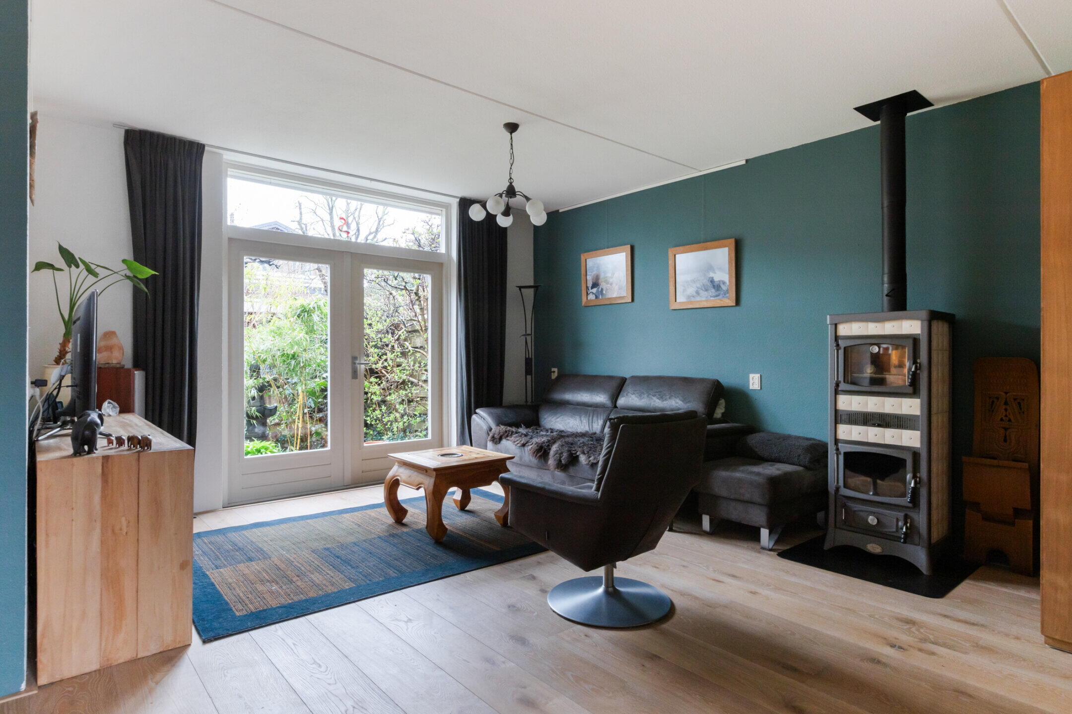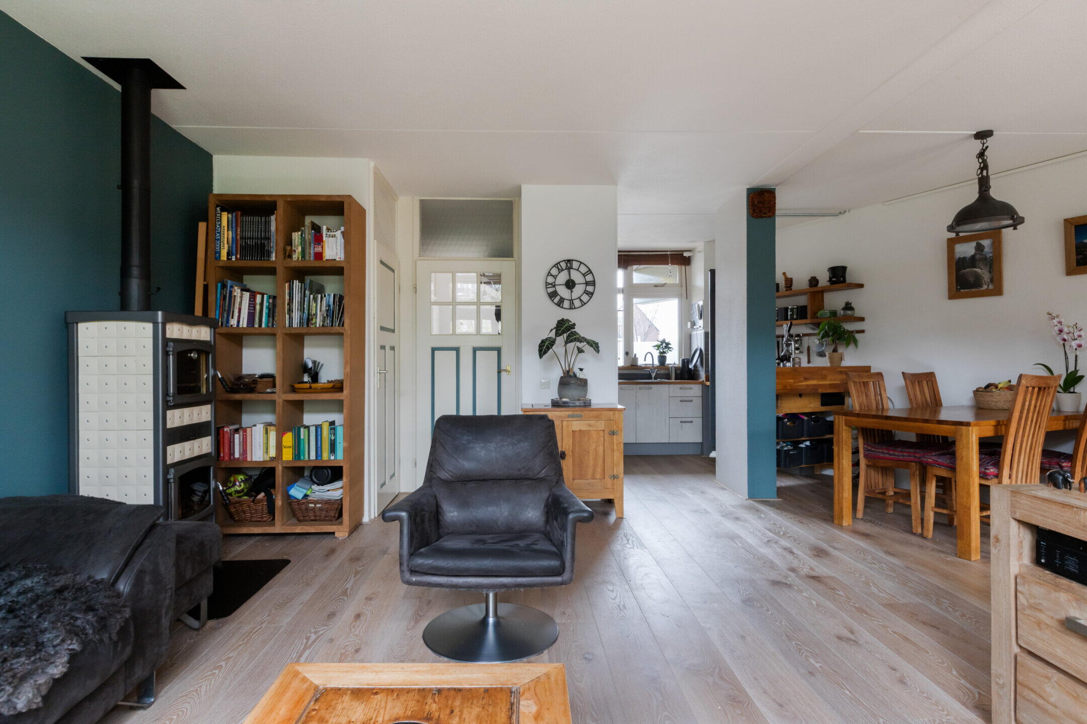Bij binnenkomst in de woning treft u de entree met meterkast, toiletruimte, massief eikenhouten vloer met vloerverwarming en trapopgang naar de eerste verdieping. Vanuit de hal heeft u toegang tot de ruime living van ca. 5,66 x 4,37/7,80 m. De woonkamer is slim ingedeeld: aan de rechterzijde bevindt zich het zitgedeelte met sfeervolle HOUTKACHEL, terwijl de linkerzijde momenteel wordt gebruikt als werkplek (bureau) en eetgedeelte. Beide zijden hebben dubbele openslaande deuren die direct toegang bieden tot de tuin.